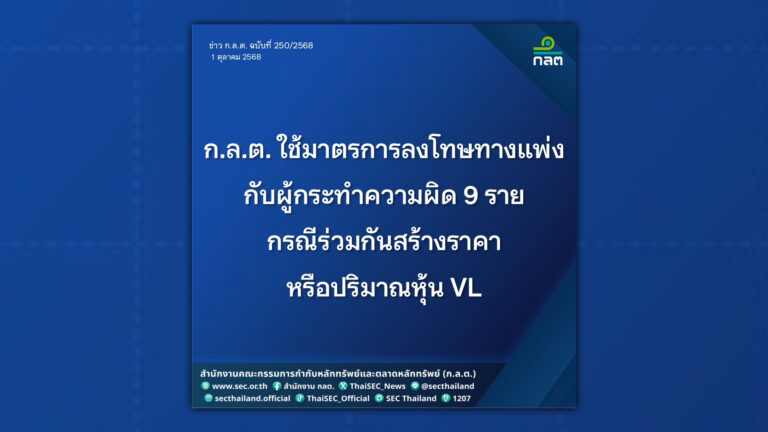 ก.ล.ต. ใช้มาตรการลงโทษทางแพ่งกับผู้กระทำความผิด 9 ราย กรณีปั่นหุ้น VL ปรับรวมกว่า 10 ล้านบาท
