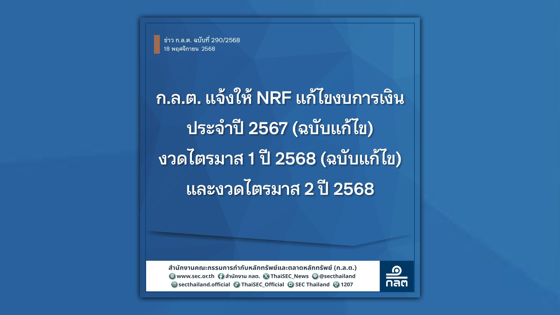 ก.ล.ต. แจ้งให้ NRF แก้ไขงบการเงินประจำปี 2567 งวดไตรมาส 1 ปี 2568 ฉบับแก้ไข และ งวดไตรมาส 2 ปี 2568