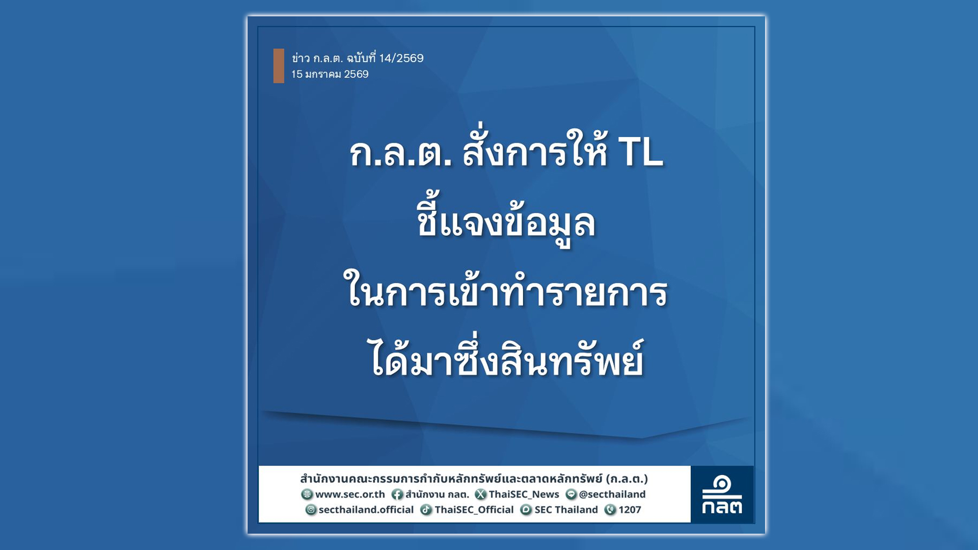 ข้อมูลธุรกรรมข้างต้นเป็นข้อมูลที่มีสาระสำคัญ จึงเป็นกรณีที่จะมีผลกระทบต่อสิทธิประโยชน์ของผู้ถือหุ้นและการตัดสินใจของผู้ลงทุน ก.ล.ต. จึงอาศัยอำนาจตามมาตรา 58(1) แห่งพระราชบัญญัติหลักทรัพย์และตลาดหลักทรัพย์ พ.ศ. 2535 ให้ TL ชี้แจงข้อเท็จจริงพร้อมเอกสารหลักฐานที่เกี่ยวข้องเพิ่มเติมเกี่ยวกับการพิจารณาลงทุนใน Nestifly ข้างต้นต่อ ก.ล.ต. ภายในวันที่ 20 มกราคม 2569 พร้อมให้เปิดเผยข้อมูลดังกล่าวต่อสาธารณชนผ่านระบบ SETLink ด้วย