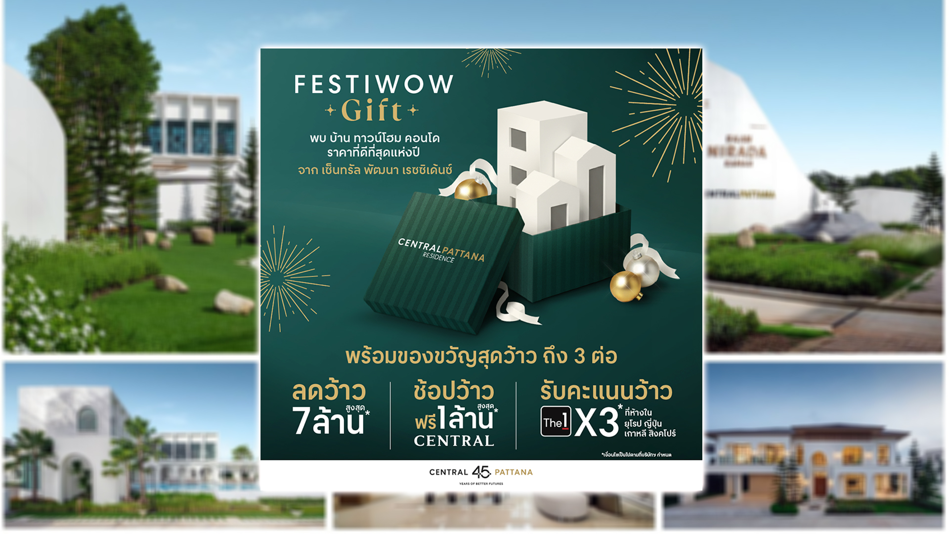 เซ็นทรัลพัฒนา เรซซิเด้นซ์ ผู้นำการพัฒนาอสังหาริมทรัพย์อย่างยั่งยืน ภายใต้แนวคิด ‘Imagining Better Living’ ร่วมเฉลิมฉลองช่วงเวลาแห่งความสุขส่งท้ายปีเพื่อ Central Citizens คนสำคัญ ด้วยแคมเปญ “FESTI ‘WOW’ GIFT” ว้าวววว!! กับดีลแรงที่สุดแห่งปีพร้อมรับของขวัญสุดยิ่งใหญ่ส่งท้ายปีถึง 3 ต่อ เมื่อซื้อบ้าน ทาวน์โฮม คอนโดฯ ทั่วไทย ไม่ว่าจะเป็นต่อที่ 1) ลดว้าว! สูงสุด 7 ล้านบาท* 2) ช้อปว้าวฟรีสูงสุด 1 ล้านบาท* ที่ร้านค้าในเครือเซ็นทรัลทุกสาขา 3) รับคะแนนว้าว! ครั้งแรกรับคะแนน The1 x3* เมื่อช้อปที่ห้างสรรพสินค้าที่ร่วมรายการในยุโรป ญี่ปุ่น เกาหลี สิงคโปร์  โดยแคมเปญฯ ดังกล่าว เริ่มตั้งแต่วันนี้ – 30 ธ.ค. นี้