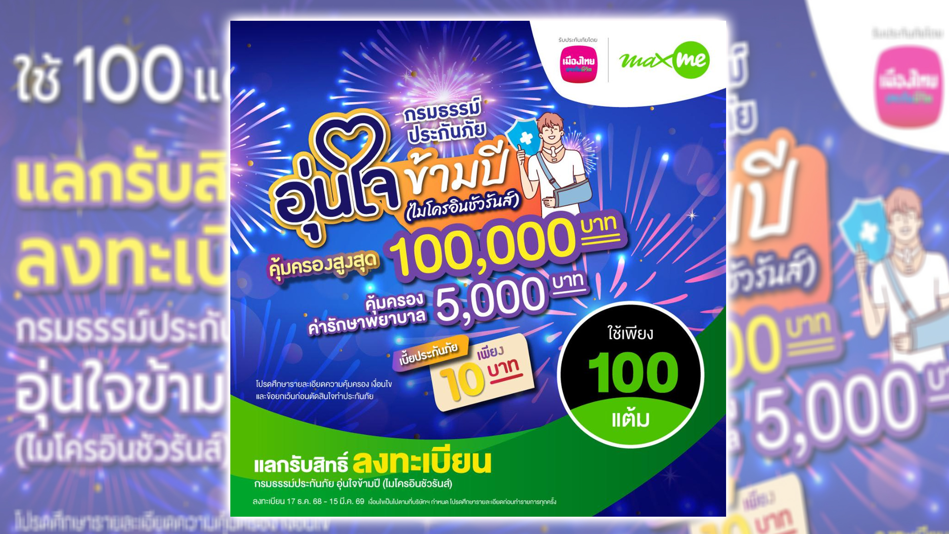เมืองไทยประกันชีวิต ผนึกกำลัง แมกซ์ โซลูชัน เซอร์วิส บริษัทในเครือพีทีจี  เพิ่มความอุ่นใจต้อนรับเทศกาลปีใหม่แก่สมาชิก Max Card ทั่วประเทศ ผ่าน“กรมธรรม์ประกันภัยอุ่นใจข้ามปี (ไมโครอินชัวรันส์)” ประกันภัยอุบัติเหตุกลุ่มที่ให้ความคุ้มครองครอบคลุมทั้งด้านชีวิตและค่ารักษาพยาบาลเนื่องจากอุบัติเหตุ เพียงใช้แมกซ์พอยท์ 100 คะแนน แลกรับสิทธิ์ผ่านช่องทางแอปพลิเคชัน Max Me  เริ่มตั้งแต่วันที่ 17 ธันวาคม 2568 – 15 มีนาคม 2569 (จำนวนสิทธิ์ 1,000 สิทธิ์)