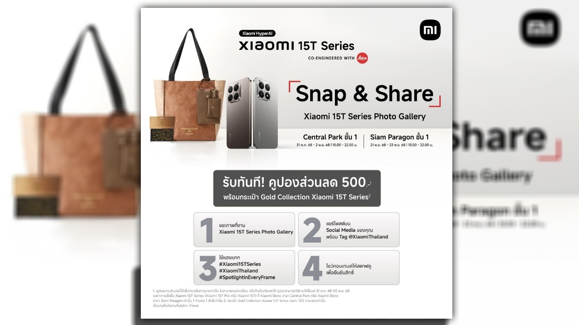 นอกจากนี้เสียวหมี่ยังจัดกิจกรรม Snap & Share โดยให้ผู้เข้าร่วมงานถ่ายภาพภายในงาน “Xiaomi 15T Series Photo Gallery: Spotlight in Every Frame” แชร์ลงบนโซเชี่ยลมีเดียพร้อมแทก @XiaomiThailand และติดแฮชแทก #Xiaomi15TSeries #XiaomiThailand #SpotlightInEveryFrame ก็รับทันทีคูปองส่วนลดมูลค่า 500 บาทและกระเป๋า Gold Collection Xiaomi 15T Series สุดเอ็กซ์คลูซีฟไปครอบครองฟรี1 ยิ่งไปกว่านั้น