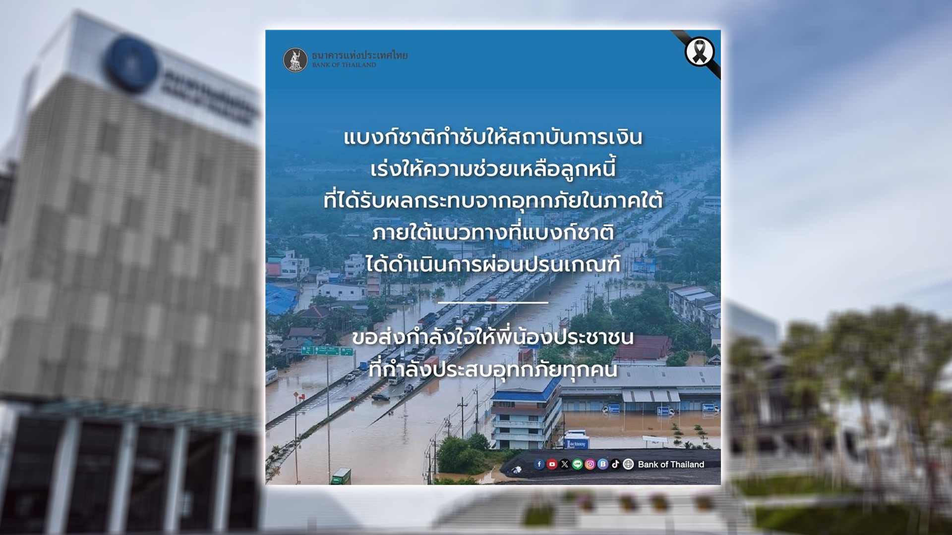 แบงก์ชาติ กำชับสถาบันการเงิน เร่งช่วยลูกหนี้ที่ได้รับผลกระทบ จากสถานการณ์อุทกภัยในภาคใต้ พร้อมส่งกำลังใจและความห่วงใยไปยังพี่น้องประชาชนผู้ประสบภัย