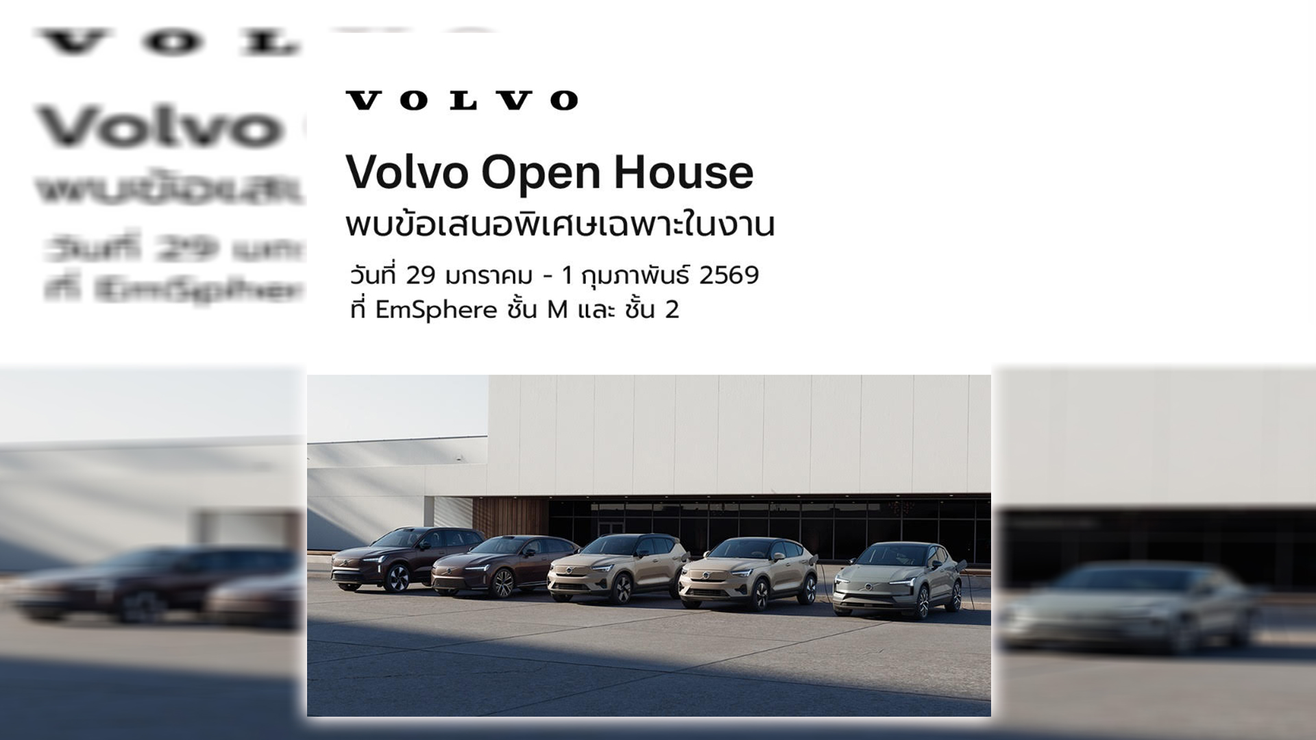 กลับมาอีกครั้งกับงาน Volvo Open House งานสุดพิเศษที่เปิดโอกาสให้ผู้สนใจเป็นเจ้าของรถวอลโว่ได้ง่ายยิ่งขึ้น พร้อมข้อเสนอสุดเอ็กซ์คลูซีฟ ครอบคลุมทั้งรถใหม่ ไม่ว่าจะเป็นรถไฟฟ้าเต็มรูปแบบ และรถปลั๊กอินไฮบริด รวมถึงรถ Volvo Selekt Certified used cars ทั้งรถผู้บริหาร รถทดลองขับ และรถป้ายแดงเลขไมล์น้อย ที่ผ่านการรับรองคุณภาพตามมาตรฐานของวอลโว่ คาร์ ประเทศไทย ให้เลือกสรรอย่างครบครันในที่เดียว งานจัดขึ้นระหว่างวันที่ 29 มกราคม – 1 กุมภาพันธ์ พ.ศ. 2569 ตั้งแต่เวลา 10.00 – 20.00 น. ณ ศูนย์การค้า The EmSphere บริเวณชั้น M และชั้น 2